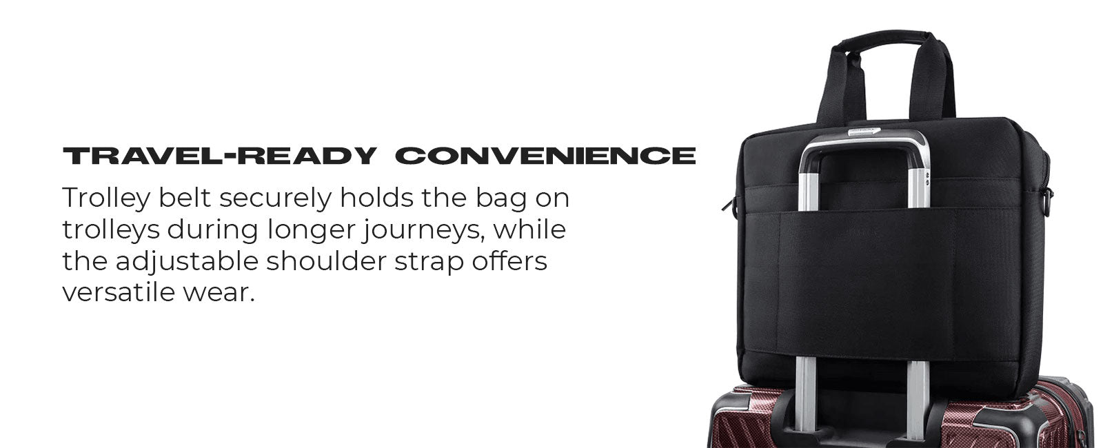 Travel-Ready Convenience: Trolley belt securely holds the bag on trolleys during longer journeys, while the adjustable shoulder strap offers versatile wear.